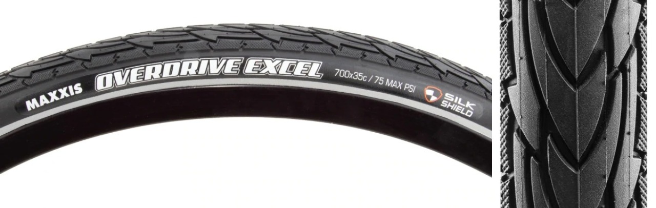 Покрышка Maxxis Overdrive Excel - одно из лучших решений велоиндустрии для городских и прогулочных велосипедов. Покрышка обладает выраженным влагоотводом, что положительно сказывается на уверенной езде и стабильном поведение в непогоду. Жесткий центральный состав (70А) позволяет покрышке иметь прекрасный накат по асфальту. Мягкие боковины (65А) осуществляют уверенный зацеп при самом крутом маневрировании. Совместима с колесами 700с, имеет распространенную ширину 35с, располагает к установке как спереди, так и сзади. Установка возможна только с камерой. В своем оснащении имеет стальной корд, дополнительную защиту от прокола SilkShield, светоотражающую полосу по боковому контуру, плетение 60 TPI, держит предельное давление 75 PSI. Maxxis один из самых продвинутых и качественных производителей, специализирующийся на производстве камер и покрышек для авто, мото и вело техники.